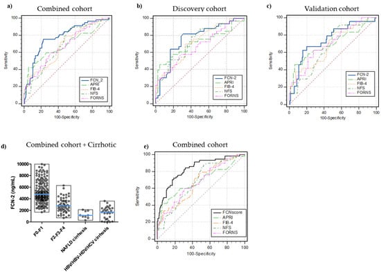 Receiver operating characteristic (ROC) curves for the diagnosis of significant fibrosis. FCN-2 vs. blood-based tests (APRI, FIB-4, NFS, FORNS) AUROCs in (a) combined cohort (n = 235, disease prevalence 24%), (b) discovery MO cohort (n = 76, disease prevalence 43%), (c) validation MO cohort (n = 159, disease prevalence 15%), (d) full picture for FCN-2 plasma levels in all samples included in the study, (e) FCNscore (FCN-2 levels, APRI, and HDL combined in a diagnostic model) vs. common blood-based tests (FIB-4, NFS, APRI, FORNS) AUROCs in the combined cohort. Significant fibrosis (F2, F3, and F4 stages).