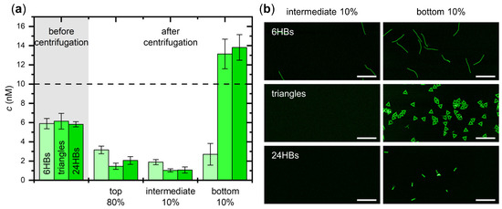 Assessing the formation of DNA origami precipitates in the bottom 20% fraction. (a) Concentrations of the DNA origami 6HBs, triangles, and 24HBs before and after centrifugation in 3 M (NH4)2SO4 determined by UV absorption. The horizontal broken line indicates the nominal starting concentration; (b) Representative AFM images of the different DNA origami nanostructures in the intermediate 10% and the bottom 10% fractions after centrifugation in 3 M (NH4)2SO4. Scale bars are 500 nm and height scales are 4 nm (6HBs), 3 nm (triangles), and 7 nm (24HBs), respectively.
