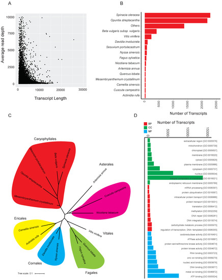 A second quality check was performed by extracting the average read depth relative to transcript length (Figure 1A) to ensure that the majority of transcripts were represented. The transcripts were similarity searched against UniProt-trEMBL, UniProt-Plant, and Arabidopsis thaliana proteome databases; 69,826 (~53%), 69,816 (~53%), and 62,922 (~48%) transcripts were annotated in S. verrucosum root transcriptome from each of the respective databases (Table S2). S. verrucosum transcripts showed high similarity (as observed from top BLAST hits) with Spinacia oleracea (22,830), Opuntia streptacantha (21,804), Beta vulgaris subsp. Vulgaris (4109), and Vitis vinifera (2296) (Figure 1B). The relationships between the identified top hit plant species are shown in Figure 1C. We were able to identify Gene Ontology (GO) IDs in 53,575 (~41%) assembled transcripts. We found 42,432 Biological Process (BP) GO ID’s, 77,656 Molecular Function (MF) GO IDs, and 45,556 Cellular Compartment (CC) GO IDs from the transcriptome (Table S3). The most abundant GO IDs found in the transcriptome are shown in Figure 1D.