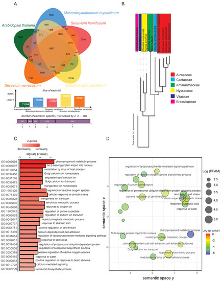 Positive selection and orthology analysis. (A) OrthoVenn2 analysis of Aizoaceae family: Sesuvium verrucosum, Sesuvium portulacastrum, Sesuvium humifusum, Mesembryanthemum crystallinum, and the outgroup Arabidopsis thaliana. (B) Single gene copy phylogenetic relationship of the Aizoaceae family with other related and distant ones using OrthoFinder. (C) PFAM enrichment of the positively selected gene families in Sesuvium identified using Fustr. Z-score reflects the strength of overlapped PFAMs and the p-value adjusted accounting for multiple hypotheses is for significance. (D) Revigo semantic analysis using the GO term of the positively selected genes. Log (PFAM size): logarithm of PFAM size and Log (p value): logarithm of p value significance.