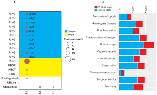 Classification and comparison of E3 ligase. (A) Abundance of E3, E2, E1 ligase in complex and single form. (B) Comparison of E3 single-RING ligase count relative to the total number of transcripts in different species (Amborella tricopoda, Arabidopsis thaliana, Boechera stricta, Brachypodium distachyon, Brassica rapa, Capsella rubella, Leersia perrieri, Oryza sativa, Sesuvium verrucosum, Sorghum bicolor, Zea mays).
