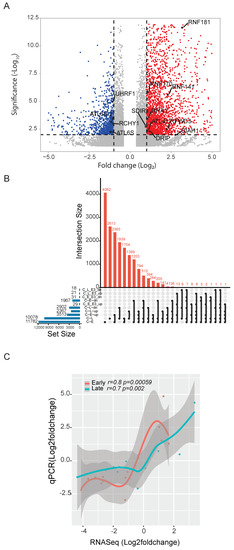 Differential gene expression analysis showed 3513 significantly upregulated genes (log2 fold change ≥ 1 and p < 0.05) and 1967 downregulated genes (log2 fold change ≤ −1 and p < 0.05) in samples from the ‘early’ salt treatment group. Comparison of the control with the ‘late’ salt treatment group showed 2367 upregulated genes and 2902 downregulated genes. The E3 ligase differential expression was limited to 13 genes at that magnitude change (Figure 4A). This is highlighted in the UpsetR intersection plot of different transcript expressions at early and late stages, including E3 ligases, which is represented at the tail of the distribution (Figure 4B). The majority are significantly (p-value < 0.05) represented by the single RING-type E3 ligase (Figure 4A,B, Table S6).