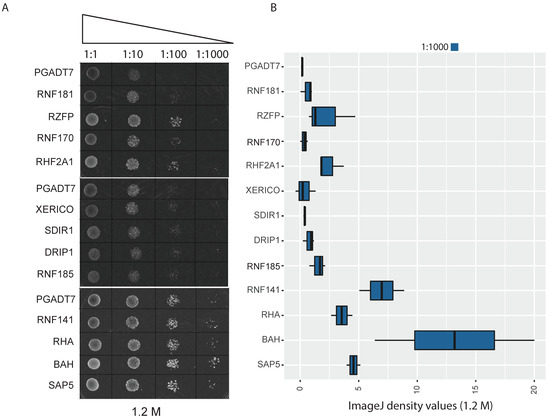 Yeast functional drop test assay. (A) Three plates representing the yeast-based functional validation of 12 selected E3 ligase genes and empty vector control (pGADT7) under 1.2 M salt concentration. The dilution factors used in this study is given on the top of the panel (column wise). (B) Image J image quantification of the drop density as a proxy for growth in replicates of the 1.2 M compared to the control.