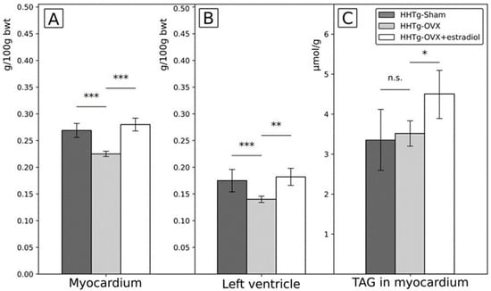 | The content of triglycerides in the myocardium (μmol/g) | 3.350 ± 0.762 | 3.509 ± 0.317 | 4.487 ± 0.602 | 0.01 | n.s. | 0.05 |