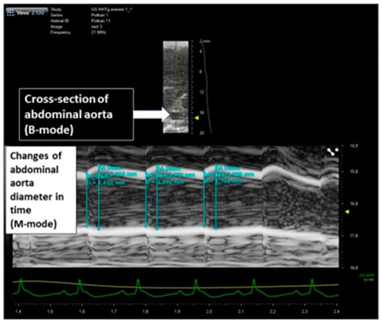 - Knipp, B.S.; Ailawadi, G.; Sullivan, V.V.; Roelofs, K.J.; Henke, P.K.; Stanley, J.C.; Upchurch, G.R., Jr. Ultrasound meas-urement of aortic diameters in rodent models of aneurysm disease. J. Surg. Res. 2003, 112, 97–101. [Google Scholar] [CrossRef]