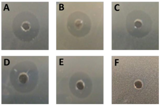 Inhibition of Lactococcus garvieae growth by GarKS cultured overnight on Mueller–Hinton agar plates at 30 °C. Note the inhibition zones around L. garvieae strain (A) b. baraja, (B) lg, (C) perbembe, (D) cp-1, and (E) Ba063090, all from infected fish. Additionally, note the absence of inhibition zone around strain KS2546 (F) which is the bacteriocin producer itself. For all L. garvieae strains, 100 µL of 107 CFU/mL bacterial suspension were spread on Mueller–Hinton agar plate, while 50 µL of 33 µg/mL GarKS were put in the well at the centre of each plate.