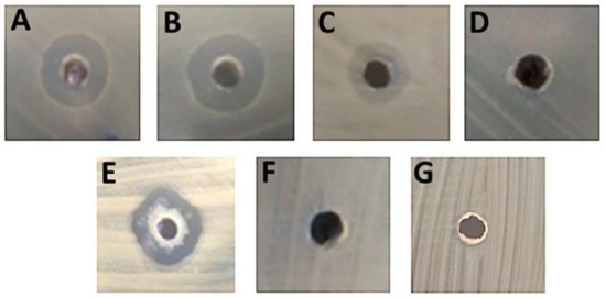 Inhibition of bacterial pathogens of fish species by GarKS cultured overnight on Mueller–Hinton agar plates. (A) Inhibition zone around Streptococcus agalactiae serotype Ia isolated from Nile tilapia (Oreochromis niloticus) in Taiwan, (B) inhibition zone around S. agalactiae serotype Ib from Nile tilapia in Taiwan, (C) inhibition zone around Aeromonas hydrophila strain 19 from rohu (Labeo rohita) in India and (D) no inhibition zone around Edwardsiella tarda from Olive flounder (Paralichthys olivaceus) in South Korea. (E) Note the presence of inhibition zone around Aeromonas salmonicida strain 6421 and the absence of inhibition zones around (F) A. salmonicida strain 6422 and (G) Yersinia ruckeri isolated from Atlantic salmon (Salmo salar L). S. agalactiae, A. hydrophila and E. tarda were cultured at 37 °C while A. salmonicida and Y. ruckeri were cultured at 25 °C. For all bacterial species, 100 µL of 107 CFU/mL bacterial suspension were spread on Mueller–Hinton agar plate while 50 µL of 33 µg/mL GarKS were put in the well at the centre of each plate.