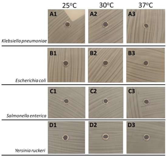 Lack of inhibition of fish and foodborne bacterial pathogens cultured overnight on Mueller–Hinton agar plates at 25 °C, 30 °C and 37 °C., Klebsiella pneumoniae (A1–A3), Escherichia coli (B1–B3), and Salmonella enterica (C1–C3) Yersinia ruckeri (D1–D3) showing no inhibition at 33 µg/mL GarKS after overnight culture on Mueller–Hinton agar plates at 25 °C, 30 °C and 37 °C.