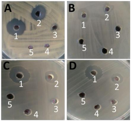 Inhibition of bacterial pathogens isolated from fish exposed to five different GarKS concentrations of 33 µg/mL (1), 3.3 µg/mL (2), 0.33 µg/mL (3), 0.033 µg/mL (4) and 0.0033 µg/mL (5). (A) Note inhibition of Aeromonas salmonicida strain 6421 at high concentrations of 33 µg/mL and 3.3 µg/mL, and no inhibition around low concentrations ≤0.33 µg/mL. (B) Inhibition around A. hydrophila for higher concentrations of 33 µg/mL and 3.3 µg/mL, and no inhibition around low concentrations ≤0.33 µg/mL GarKS. (C) Inhibition of Streptococcus agalactiae serotype Ia for high concentration of 33 µg/mL and 3.3 µg/mL and no inhibition on low concentrations ≤0.33 µg/mL GarKS. (D) Inhibition of S. agalactiae serotype Ib high concentrations of 33 µg/mL and 3.3 µg/mL and no inhibition on low concentrations ≤0.33 µg/mL GarKS.