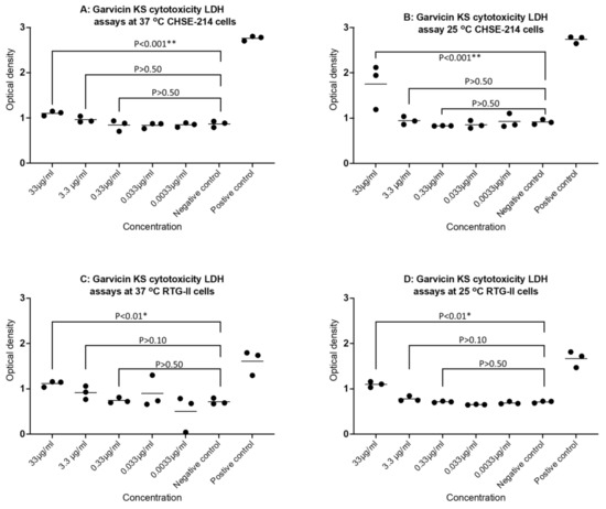 Cytotoxicity based on the LDH assay was only observed at the highest concentration, 33 µg/mL GarKS in CHSE-214 cells cultured at 25 °C and 37 °C. That said, leakage of LDH in CHSE-214 cells exposed to 33 µg/mL GarKS was significantly lower (p < 0.001) than in cells treated with the positive control LDH solution (Figure 5A,B). There was indication of induced cytotoxicity in CHSE-214 cells treated with lower concentrations of GarKS (≤3.3 µg/mL), cultured at 25 °C and 37 °C (Figure 5A,B). For RTG-2 cells, cytotoxicity was only observed in cells treated with the highest concentration of 33 µg/mL GarKS cultured at 25 °C and 37 °C (p < 0.01) (Figure 5C,D), and again levels of leakage were significantly lower (p < 0.0001) than in cells treated with the LDH positive control solution (Figure 5C,D). No cytotoxicity was observed in RTG-2 cells treated with concentrations ≤3.3 µg/mL GarKS cultured at 25 °C and 37 °C (Figure 5C,D).