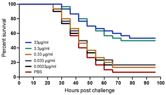 Kaplan Meyer’s post challenge survival analysis of zebrafish larvae challenged with Lactococcus garvieae after treatment with five different concentrations (33 µg/mL, 3.3 µg/mL, 0.33 µg/mL, 0.033 µg/mL, and 0.0033 µg/mL) of GarKS.