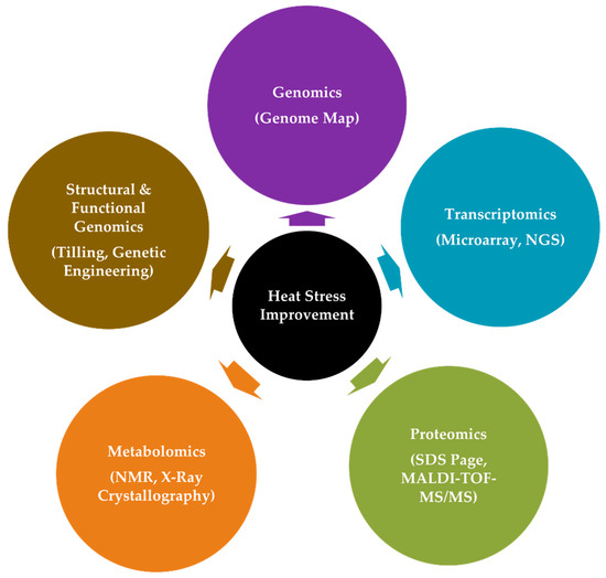 The genome is the sum total of genetic make-up of an organism and genomics provide in-depth information concerning gene structures, functions, interconnected networks, as well as metabolic and biochemical processes they are involved in [202]. Genomics evolved in diverse stages from first generation (1970s) to next generation (20th Century) to third generation sequencing (21st Century) [203]. Structural genomics helps to identify structure of a gene, prompter sequences, and other regulatory sequences located upstream or downstream [204], whereas functional genomics facilitate gene function at a molecular level and the type of tolerance (HS, salt, drought) it provides [205,206]. Therefore, genomics aids in providing genome wide network information of genes and their interaction with other complex stress-resilient traits [207]. Wheat cultivars can be genetically engineered for HS tolerance using the CRISPR/Cas9 system and other online genomics tools for further research and understanding on plant abiotic stress tolerance [208]. The fully annotated complete reference genome of wheat (cultivar ‘Chinese Spring’) was completed in 2018 and is available at Unité de Recherche Génomique Info (URGI) research unit in genomics and bioinformatics at French National Institute for Agriculture, Food and Environment (INRAE) (https://wheat-urgi.versailles.inra.fr/Seq-Repository; (accessed on 16 February 2022) and International Wheat Genome Sequencing Consortium hosted at ENSEMBL-Plants portal (https://plants.ensembl.org/Triticum_aestivum/Info/Index; accessed on: 16 February 2022) [179].
