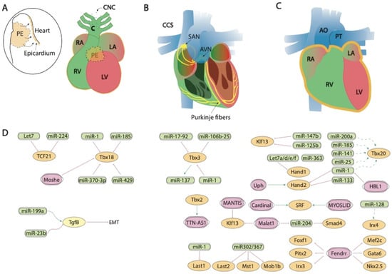 Schematic representation of the mid-developmental events during cardiovascular development, ranging from the epicardial lining of the developing heart and the arrival of the cardiac neural crest cells (A), the early configuration of the cardiac conduction system (B) and chamber septation process (C). (D) represent the current molecular interaction between microRNAs and lncRNAs with distinct growth factors and transcription factors involved in these developmental processes. PE, proepicardium, CNC, cardiac neural crest, CCS, cardiac conduction system, RA, right atrium, LA, left atrium, RV, right ventricle, LV, left ventricle, SAN, sinoatrial node, AVN, atrioventricular node, AO, aorta, PT, pulmonary trunk.