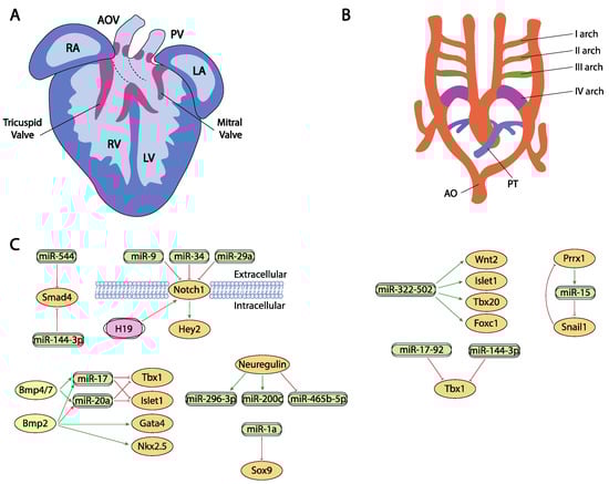 Schematic representation of the cardiac chamber and valvular morphogenesis (A) and the configuration and remodeling of the aortic arches (B). (C) represent the current molecular interaction between microRNAs and lncRNAs with distinct growth factors and transcription factors involved in these developmental processes. RA, right atrium, LA, left atrium, RV, right ventricle, LV, left ventricle, AO, aorta, PT, pulmonary trunk.