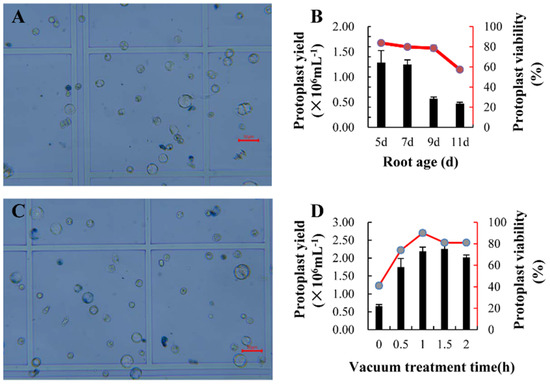 Effects of age and vacuum treatment time in protoplast isolation from G. arboreum lateral root tips. (A) The protoplasts stained with Trypan blue solution, which were isolated from 5-day-old lateral root tips. Scale bar, 50 μm; (B) Effect of root age on the yield and viability of protoplasts isolated from the cotton lateral root tips; data presented as means of three biological replicates with error bars indicating standard deviations (SD). The bar graph represents protoplast yield (×106) and the red broken line graph represents protoplast viability (%); (C) The protoplasts stained with Trypan blue solution, which were isolated from the lateral root tips, were treated by vacuum for 1 h. Scale bar, 50 μm; (D) Effect of vacuum treatment time on the yield and viability of protoplasts isolated from the cotton lateral root tips; data presented as means of three biological replicates with error bars indicating standard deviations (SD). The bar graph represents protoplast yield (×106) and the red broken line graph represents protoplast viability (%). 4.6 cm left.
