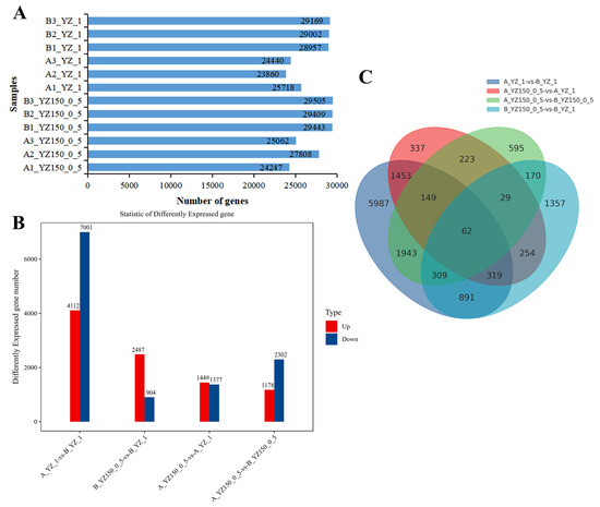 Total number of expressed genes and specific differentially expressed genes (DEGs) in different groups. (A) Total number of expressed genes in each sample; (B) Numbers of down- and up-regulated DEGs in different comparison samples. (C) Veen diagram for DEGs in different comparison samples.