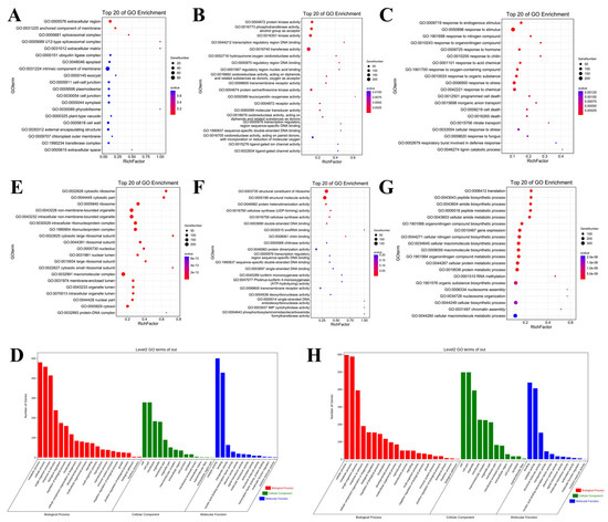 The Gene Ontology (GO) analysis and the top 20 of GO enrichment of DEGs in B-YZ150–0.5 vs. B-YZ−1 and A-YZ150–0.5 vs. A-YZ−1. The top 20 of GO enrichment of DEGs in (A) Cellular Component, (B) Molecular Function, (C) Biological Process and the (D) GO level secondary gene annotation in B-YZ150–0.5 vs. B-YZ−1; The top 20 of GO enrichment of DEGs in (E) Cellular Component, (F) Molecular Function, (G) Biological Process and the (H) GO level secondary gene annotation in B-YZ150–0.5 vs. B-YZ−1.