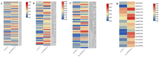 The expression patterns of genes involved in plant hormone signal transduction and MAPK signaling pathways. (A) B-YZ150–0.5 vs. B-YZ−1 and (B) A-YZ150–0.5 vs. A-YZ−1 show the gene expression involved in plant hormone signal transduction, and (C) B-YZ150–0.5 vs. B-YZ−1 and (D) A-YZ150–0.5 vs. A-YZ−1 show the gene expression involved in MAPK signaling pathways.
