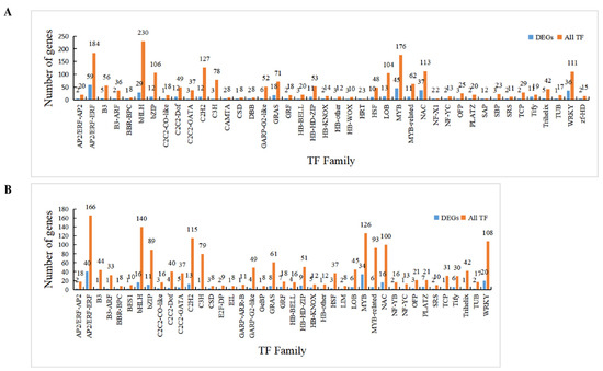 The distribution of TFs family with differential expression in (A) B-YZ150–0.5 vs. B-YZ−1 and (B) A-YZ150–0.5 vs. A-YZ−1. The X-axis represents the transcription factor (TF) families, and the Y-axis represents the number of genes.