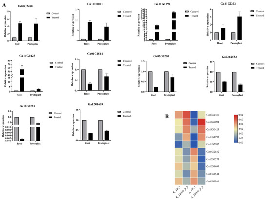Quantitative real-time PCR (qRT-PCR) validation and RNA-seq data of ten selected DEGs. The figures show the (A) qRT-PCR data and the (B) RNA-seq data.