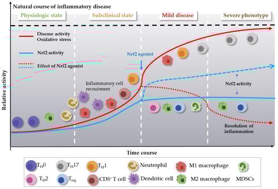Links between immune cells, inflammatory disease activity, and levels of oxidative stress. Exposure of the immune system to oxidative stress increases inflammatory disease activity. Oxidative stress is sensed by the Nrf2 system, which induces intracellular signaling pathways in immune cells, thereby triggering an immediate innate immune response, followed by differentiation of adaptive immune cells. Ideally, an effective compensatory response is elicited by increased expression of Nrf2, which restores homeostasis. Severe oxidative stress that can be more than physiologically compensated by the Nrf2 response leads to an increase and uncompensated response in the form of excessive inflammation; for example, increased expression of Th17. This leads to aggravation of inflammatory disease activity. Thus, administration of Nrf2 agonist can play an important role in regulating immune homeostasis.