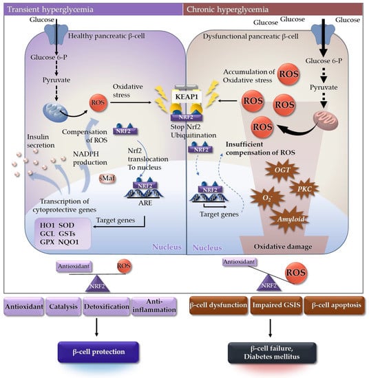 In healthy β-cells, acute transient hyperglycemia-induced oxidative stress is regulated by transcription of ARE-driven genes (Figure 4) []. Nrf2 is a master regulator of ARE-driven genes in pancreatic β-cells [,]. During hyperglycemia, insulin secretion is increased along with expression of detoxifying enzymes and antioxidants []. In response, ROS are attenuated by Nrf2 [] and β-cells are protected from oxidative stress. However, chronic exposure to hyperglycemia leads to accumulation of ROS due to incomplete reduction of oxygen during glucose metabolism [,]. In addition, aberrant glucose metabolism generates ROS through activation of protein kinase C, glucose auto-oxidation, generation of excessive superoxide, increased hexosamine metabolism, and increased islet amyloid deposition [,,]. A major factor contributing to pancreatic β-cell dysfunction is oxidative stress-mediated mitochondrial damage []. Therefore, chronic exposure to high ROS levels can result in β-cell dysfunction, impaired glucose-induced insulin secretion, and β-cell apoptosis [].