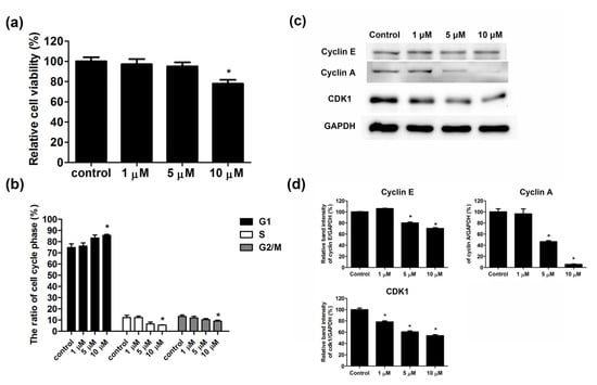 Simvastatin inhibited the proliferation of skeletal muscle cells. Skeletal muscle cells were untreated or treated with 1, 5, or 10 μM simvastatin for 24 h. (a) Cell viability was determined using the MTT assay. (b) Cell cycle analysis was performed. (c) Cell extracts were examined through Western blot analysis. (d) The band intensities of cyclin E, cyclin A, and CDK1are shown. GAPDH was used as the internal control. Data are presented as the mean ± standard error of the mean of six independent experiments. * p < 0.05.