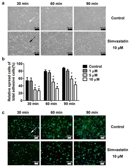 Simvastatin inhibited the spreading of skeletal muscle cells. (a) Skeletal muscle cells were untreated or treated with 1, 5, or 10 μM simvastatin for 24 h and plated on culture dishes. After plating for 30, 60, and 90 min, the attached cells started to spread out and were photographed at 100×. The numbers of spreading cells were decreased after simvastatin treatment. The spreading and nonspreading cells are indicated by white and black arrows, respectively. Scale bars: 120 μm. (b) The ratio of spreading cells to adhesion cells was decreased after simvastatin treatment. Data are presented as the mean ± standard error of the mean of six independent experiments. * mean p < 0.05 compared with control. (c) F-actin was stained green; nuclei were stained blue. Scale bars: 100 μm. The spread cells are indicated by white arrows.