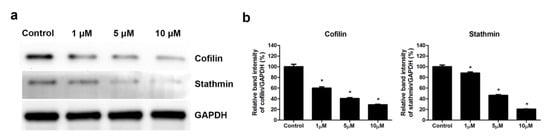 Skeletal muscle cells were untreated or treated with 1, 5, or 10 μM simvastatin; the protein extracts were analyzed through Western blot analysis. The protein expressions of stathmin and cofilin are shown in Figure 6a. The band intensity of cofilin was 100.0% ± 4.6% in control cells and 60.0% ± 2.3%, 40.6% ± 1.6%, and 28.8% ± 1.1% in cells treated with 1, 5, and 10 μM simvastatin, respectively. The band intensity of stathmin was 100.0% ± 3.2% in control cells and 88.2% ± 2.1%, 46.4% ± 1.5%, and 20.5% ± 0.6% in cells treated with 1, 5, and 10 μM simvastatin, respectively (Figure 6b). The results of Western blot and band intensity analyses indicated that simvastatin suppressed the protein expression of cofilin and stathmin.