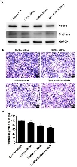 To examine the roles of cofilin and stathmin in cell migration, cofilin and stathmin were knocked down using specific siRNAs. The protein expression of cofilin and stathmin was decreased in the cofilin and stathmin siRNA groups, respectively, and downregulated in the cofilin plus stathmin siRNA group (Figure 7a). Furthermore, the migration ability of skeletal muscle cells transfected with cofilin siRNA, stathmin siRNA, and cofilin siRNA plus stathmin siRNA was significantly decreased (Figure 7b). The relative cell migration rates were 100.0% ± 2.9%, 87.7% ± 4.0%, 73.7% ± 2.6%, and 67.1% ± 2.5% in the control siRNA group, cofilin siRNA group, stathmin siRNA group, and cofilin plus stathmin siRNA group, respectively (p < 0.05, Figure 7c).