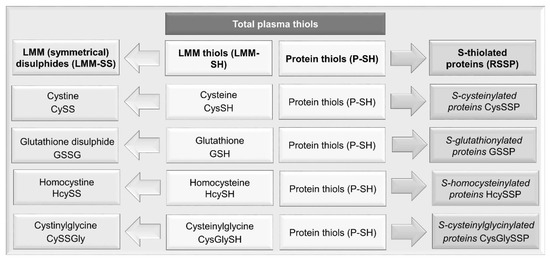 Plasma thiols can be categorized into P-SH and LMM-SH which are not bound to protein; the latter can generate both low molecular mass symmetrical disulphides (LMM-SS) and mixed disulphides with proteins (or S-thiolated proteins, RSSP) (Figure 1). LMM-SH—i.e., homocysteine, cysteinylglycine, cysteine and glutathione (GSH)—are present in the plasma of healthy subjects at a low concentration range of 0.1–12 μM, and all together constitute only 12–20 μM [41,50]. The major thiol/disulphide redox pool in mammalian plasma is the cysteine/cystine couple. Free cysteine (CysSH) has a physiological plasma concentration of approximately 10 µM [50]. It is susceptible to oxidation, forming disulphides with itself (cystine, CySS) or with protein thiols. As Cys-SH is more reactive than GSH in thiol-disulphide exchange with plasma proteins [51], the latter are mainly reversibly S-cysteinylated (Figure 2).