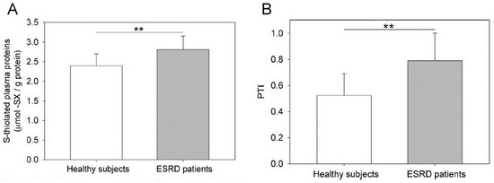 S-thiolated plasma proteins and PTI in ESRD patients compared to healthy subjects. (A) The plasma proteins of ESRD patients (n = 20) and age-matched healthy subjects (n = 20) were analysed for their total S-thiolated protein content by colorimetric reaction with ninhydrin. The data are expressed as the mean ± SD. The differences between the means of the two groups were evaluated using Student’s t-test (** = p < 0.001). (B) The plasma of both ESRD patients (n = 20) and age-matched healthy subjects (n = 20) was analysed for PTI. The data are expressed as the mean ± SD. The differences between means of the two groups were evaluated using Student’s t-test (** = p < 0.001). Reprinted with permission from Colombo et al. [101].