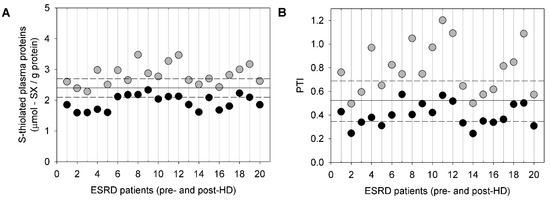 S-thiolated plasma proteins and PTI in ESRD patients pre-HD and post-HD. (A) The effects of HD on the total plasma thiol levels before (grey circles) and immediately after (black circles) HD were examined in patients with ESRD who received maintenance dialysis (n = 20). The horizontal solid line represents the mean of the total plasma thiol level in age-matched healthy subjects. The horizontal dashed lines represent the SD of the total plasma thiol level in age-matched healthy subjects. (B) The effects of HD on the S-thiolated plasma protein levels before (grey circles) and immediately after (black circles) HD were examined in patients with ESRD on maintenance dialysis (n = 20). The horizontal solid line represents the mean of the S-thiolated plasma protein levels in age-matched healthy subjects. The horizontal dashed lines represent the SD of the plasma S-thiolated plasma protein level in age-matched healthy subjects. Reprinted with permission from Colombo et al. [101].