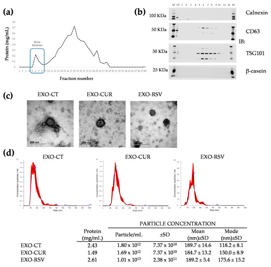 Figure 1. (a) Protein concentration (mg/mL) of isolated and purified EXOs in SEC fractions. (b) Western blot analysis of proteins present (CD63 and TSG101) or absent (calnexin and β-casein) in EXO fractions. (c) Transmission electron microscopy observations of milk-derived EXOs isolated via the passive incubation method (scale bar: 200 nm). (d) Size and distribution profiles of milk-derived EXOs (EXO-CT, EXO-CUR, and EXO-RSV) isolated via the passive incubation method.