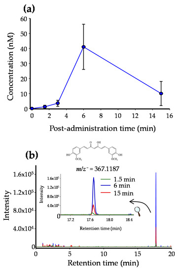 Figure 2. (a) CUR kinetic distribution in the rat mammary tissue. (b) Extracted ion chromatograms show CUR’s molecular ion intensities after 1.5, 6, and 15 min of EXO-CUR intravenous administration. A minimum of 3 animals were used for each time point. Data are shown as mean ± standard deviation (SD).