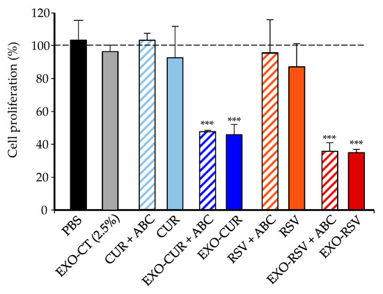Figure 3. Cell proliferation of MCF-7 cells after treatment with free CUR (48 nM), free RSV (375 nM), EXO-CUR (48 nM), and EXO-RSV (375 nM), in the presence or absence of a mixture of ABC transporter inhibitors (1 µM each) after 72 h. *** p < 0.001 (EXO-CUR and EXO-RSV vs. EXO-CT). EXO-CT: milk control exosomes; ABC: transporter inhibitors CP100356 (P-glycoprotein (P-gp) inhibitor), Ko143 (breast cancer resistant protein (BCRP) inhibitor), and probenecid (multidrug-resistant protein (MRP) inhibitor). Data are presented as the mean ± SD of at least three independent experiments (n = 6 wells per experiment).