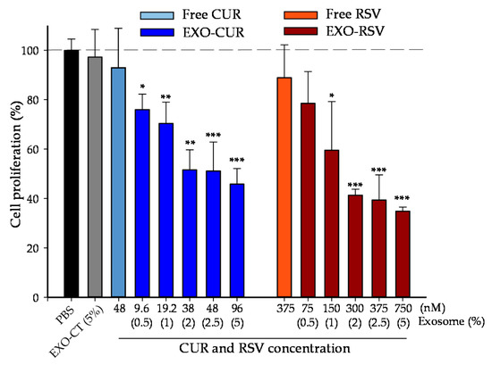 Figure 4. Comparison of the effect of free CUR and RSV vs. EXO-CUR and EXO-RSV on MCF-7 cell proliferation after 72 h. * p < 0.05; ** p < 0.01; *** p < 0.001 (EXO-CUR and EXO-RSV vs. EXO-CT). EXO-CT: non-loaded milk-derived EXOs. The X-axis shows the concentration of CUR and RSV that the EXOs incorporate (nM) and, below, the equivalent % of the fraction of EXOs tested in the cell media. Data are presented as the mean ± SD of at least three independent experiments (n = 6 wells per experiment).