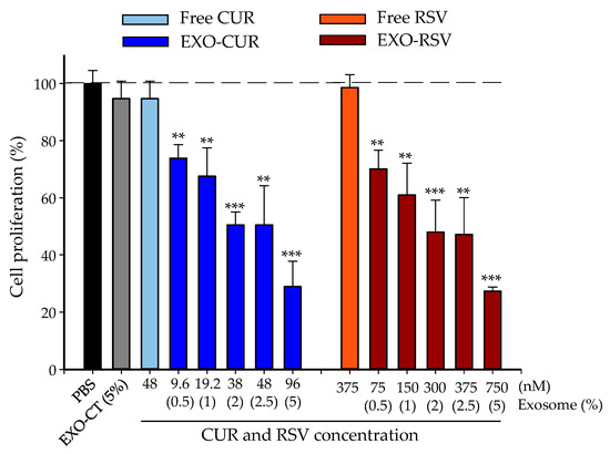 Figure 5. Comparison of the effect of free CUR and RSV vs. EXO-CUR and EXO-RSV on MDA-MB-231 cell proliferation after 72 h. The asterisks indicate statistically significant differences between EXO-CUR and EXO-RSV vs. control (non-loaded) EXOs (EXO-CT). ** p < 0.01; *** p < 0.001. The X-axis shows the concentration of CUR and RSV incorporated by EXOs and, below, the % of the EXO fraction tested in the cell media. Data are presented as the mean ± SD of at least three independent experiments (n = 6 wells per experiment).