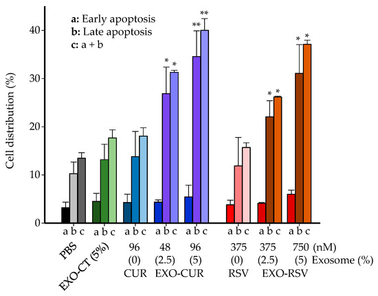 Figure 6. Comparison of the apoptosis induction exerted by CUR and RSV vs. EXO-CUR and EXO-RSV in MCF-7 after 72 h. EXO-CT: non-loaded milk-derived EXOs. * p < 0.05; ** p < 0.01 (significant differences for EXO-CUR and EXO-RSV vs. EXO-CT). Data are shown as the mean ± SD of 3 independent experiments (2 wells per treatment) for each time point.