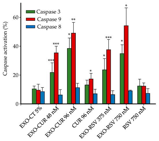 Figure 7. Comparison of caspases activation in MCF-7 cells exerted by CUR and RSV vs. EXO-CUR and EXO-RSV after 72 h. EXO-CT: non-loaded milk-derived EXOs. * p < 0.05; ** p < 0.01; *** p < 0.001 (significant differences vs. EXO-CT). Data are shown as the mean ± SD of three experiments for each treatment (n = 2 plates per experiment).
