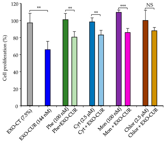 Figure 8. Effect of cellular uptake inhibitors on the antiproliferative activity of EXO-CUR in MCF-7 cells. Inhibitors and EXO-CUR were incubated for 4 h. Then, the cell medium was replaced by another one without inhibitors or EXO-CUR and kept for 48 h. EXO-CT: non-loaded EXOs. Phe: phenylarsine; Cyt: Cytochalasin D; Mon: monensin; Chlor: chlorpromazine. ** p < 0.01; *** p < 0.001. NS: not significantly different. Experiments were carried out three times for each treatment (n = 3 plates per experiment).