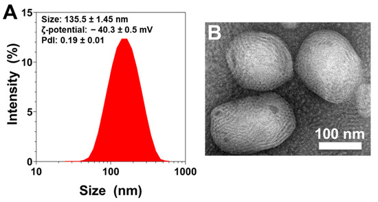 Physical evaluation of rapeseed liposomes. (A) Size distribution measurements, and average size, ζ-potential, and polydispersity index values of liposomes measured by dynamic light scattering. The reported data are represented as mean ± SD of at least three individual experiments. (B) Representative transmission electron microscopic picture of liposomes. The white scale bar corresponds to 100 nm. PDI—polydispersity index; SD—standard deviation.