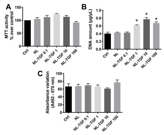 To evaluate the impact of empty nanoliposomes and TGF-β1-loaded nanoliposomes on cell behavior, the following parameters were estimated: cell metabolic activity, cell proliferation, and nanoliposome potential cytotoxicity.