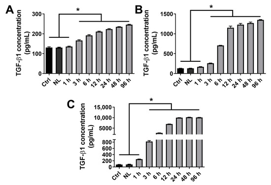 Kinetics of TGF-β1 release from rapeseed nanoliposomes in cell culture medium. Cells were untreated or exposed to 100 µg/mL nanoliposomes, either encapsulating or not 0.1 (A), 1 (B) or 10 (C) ng/mL of recombinant TGF-β1 from 1 h to 96 h. The release of TGF-β1 in cell culture media was quantified by ELISA. The reported data are represented as mean ± SD of at least four individual experiments. Significance is indicated as * with p < 0.01. Ctrl—control cells meaning untreated chondrocytes; ELISA—enzyme-linked immunosorbent assay; NL—empty nanoliposomes; NL-TGF—TGF-β1-loaded nanoliposomes; NL-TGF 0.1—nanoliposomes encapsulating 0.1 ng/mL of TGF-β1; SD—standard deviation; TGF-β1—transforming growth factor-β1.
