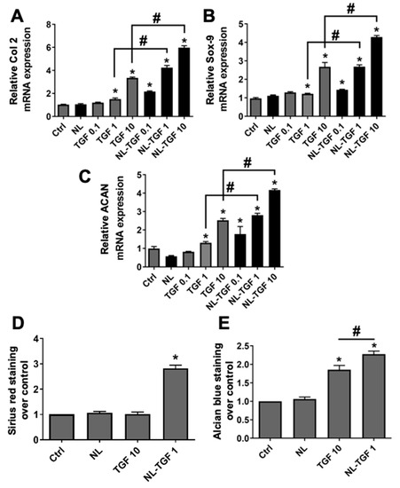 To evaluate the efficacity of TGF-β1 released in cell culture medium by rapeseed nanoliposomes, cells were cultured with different concentrations of TGF-β1 alone (0.1, 1 and 10 ng/mL) or NL-TGF (containing 0.1, 1 and 10 ng/mL). NL-TGF induced the expression of Col 2 (Figure 4A), Sox-9 (Figure 4B), and ACAN (Figure 4C) genes, which are markers of articular phenotype, with a greater effect than nonencapsulated TGF-β1. As the conditions TGF 10 and NL-TGF 1 provided similar results for gene expression (Figure 4A–C), they were used to evaluate the presence of articular ECM components at a global level. Staining with Sirius red and alcian blue allowed us to assess levels of total collagen and glycosaminoglycans (GAG), respectively (Figure 4D,E). NL-TGF 1 significantly increased collagen levels compared to control, contrary to TGF 10 (Figure 4D). NL-TGF 1 and TGF 10 were able to significantly increased GAG levels compared to control with a greater effect for NL-TGF 1 (Figure 4E). These results show that nanoliposomes allow the use of a lower TGF-β1 concentration in rat chondrocyte culture to better maintain their articular phenotype than the growth factor alone.