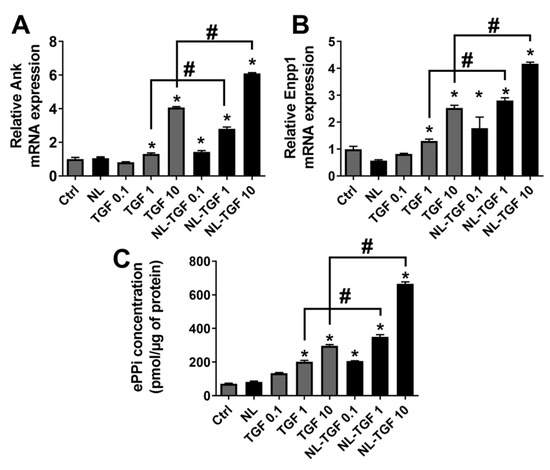 It has previously been demonstrated that the PPi machinery in chondrocytes (biosynthesis and export) is very reactive to TGF-β1 treatment that induces the expression of genes involved in the production of extracellular PPI (ePPi) such as inorganic pyrophosphate transport regulator (Ank) and ectonucleotide pyrophosphatase/phosphodiesterase 1 (Enpp1) [26]. This statement was used as a gold standard to evaluate the effect of TGF-β1 alone or encapsulated in rapeseed nanoliposomes on Ank and Enpp1 gene expression and on PPi export by rat articular chondrocytes. After a treatment with TGF-β1 alone, a strong expression of Ank and Enpp1 can be observed for TGF 10 while TGF 0.1 had no effect (Figure 5A,B). The gradual liberation of PPi was proportional to the increase in concentration of TGF-β1 alone. (Figure 5C). When TGF-β1 is encapsulated in nanoliposomes, the effect was even more important for NL-TGF 10 but was also present at NL-TGF 0.1 and NL-TGF 1 (Figure 5A,B). The dosage of ePPi confirmed these results (Figure 5C). These results showed that conditions with NL-TGF had a significantly greater effect than those with TGF-β1 alone on the PPi machinery in chondrocytes. Indeed, similar to previous readouts, the conditions TGF 10 and NL-TGF 1 provided a similar effect.
