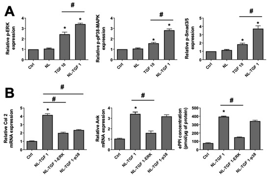 Activation status of TGF-β1 signaling pathways on chondrocyte. (A) Signaling events induced by TGF-β1. Rat chondrocytes were untreated or exposed to 100 µg/mL of nanoliposomes encapsulating or not encapsulating TGF-β1 (1 ng/mL), or to TGF-β1 alone (10 ng/mL) for 10 min (p-ERK and p-p38-MAPK) or 3 h (p-Smad3/5). Total proteins were extracted from cells and subjected to Western blotting using anti-phospho-ERK, anti-phospho-p38-MAPK or anti-phospho-Smad3/5. The relative abundance of these proteins was normalized to that of β-actin protein. The reported data are represented as mean ± SD of at least three individual experiments. Significance is indicated as * when compared to Ctrl and # when compared to TGF-β1 alone (p < 0.01). (B) Rat chondrocytes were exposed to 100 µg/mL of nanoliposomes encapsulating or not encapsulating TGF-β1 (1 ng/mL) for 24 h (mRNA) or 48 h (PPi), and with or without 10 μM of SB203580 (a selective p38-MAPK inhibitor) or 30 μM of PD98059 (a MEK-1 inhibitor) added 1 h before TGF-β1. Total RNA was extracted then reverse transcribed into cDNA and analyzed by real-time PCR. The relative abundance of Col 2 and Ank was normalized to RP29. Quantifications were made by using the ΔΔCt method. ePPi levels in culture supernatant of rat chondrocytes were assayed radiometrically and normalized to the amount of total cell proteins. The reported data are represented as mean ± SD of at least three (mRNA) or six (ePPi) individual experiments. Significance is indicated as * when compared to NL and # (p < 0.01). Ank—inorganic pyrophosphate transport regulator; Ctrl—control cells, meaning untreated chondrocytes; ePPi—extracellular inorganic pyrophosphate; ERK, extracellular signal-regulated kinase; MEK-1, mitogen-activated protein kinase/extracellular signal-regulated kinase kinase 1; NL—empty nanoliposomes; NL-TGF—TGF-β1-loaded nanoliposomes; NL-TGF 1—nanoliposomes encapsulating 1 ng/mL of TGF-β1; NL-TGF 1-ERK—condition NL-TGF 1 after ERK pathway inhibition (PD98059); NL-TGF 1-p38—condition NL-TGF 1 after p38 pathway inhibition (SB203580); p38-MAPK—p38 mitogen-activated protein kinase; PCR—polymerase chain reaction; p-ERK—phosphorylated ERK or phospho-ERK; p-P38—phosphorylated p38 or phospho-P38; p-Smad3/5—phosphorylated pSmad3/5 or phospho- pSmad3/5; RP29—ribosomal protein 29; SD—standard deviation; TGF-β1—transforming growth factor-β1; TGF 10—TGF-β1 alone at a concentration of 10 ng/mL.