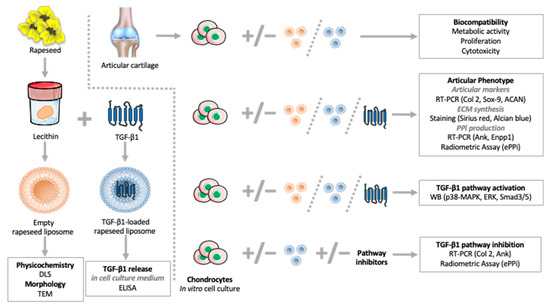 Ultimately, agro-based rapeseed liposomes were recently proposed as a new, safe and effective alternative for chondrocyte transfection [6]. Liposomes are mainly composed of amphiphilic phospholipids, and due to the similarities between their lipid bilayer and biological membranes, they are a promising delivery system, which can safely deliver and control the release of drugs and bioactive molecules [7,8,9]. Furthermore, bioactive agents are well protected once encapsulated in liposomes from the external harsh in vivo environment [10,11,12]. This could solve the short half-life, low stability and poor penetration into cartilage of transforming growth factor (TGF)-β1, which has shown positive effects on chondrocytes [13,14,15,16] by binding to their receptors and activating signaling pathways among which the best known are extracellular signal-regulated kinase (ERK), p38-mitogen-activated protein kinase (p38-MAPK) and Smad [17,18,19]. Indeed, TGF-β1 is known to retain chondrocyte articular phenotype by inducing the genes coding for Col 2, ACAN and Sox-9 [16,20], as well as the release of inorganic pyrophosphate (PPi) [21,22]. Additionally, the lipidic composition of rapeseed liposomes is of great interest, since they possess a high level of mono- and poly-unsaturated fatty acids, mainly linoleic acids (ω-6) and linolenic acids (ω-3), essential for human health and cannot be produced by the human body [23,24,25].