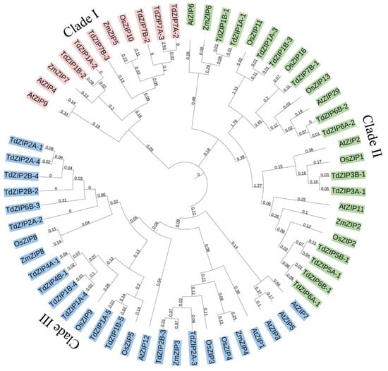 Phylogenetic relationships of the 33 TdZIPs, 11 OsZIPs, 7 ZmZIPs, and 11 AtZIPs. The subgroups (clades I, II, and III) of the ZIPs were marked in different color.