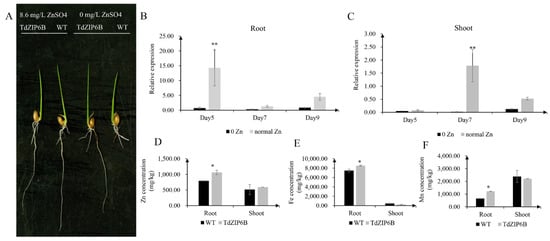 Comparison of phenotypes and metal concentration between TdZIP6B-1 overexpression lines (TdZIP6B) and WT plants under no Zn (0 mg/L ZnSO4) and normal Zn (8.6 mg/L ZnSO4.7H2O) conditions. (A) Morphology of rice seedlings that were exposed to no Zn and normal Zn for 14 days. (B,C) The expression levels of TdZIP6B-1 in transgenic lines exposed to no Zn and normal Zn conditions for 5, 7, and 9 days. (D–F) The Zn, Fe, and Mn concentrations in roots and shoots of TdZIP6B and WT plants under normal Zn condition at 14 days. Error bars show SE and the symbol * and ** indicate statistical differences (p < 0.05 and p < 0.01, respectively).